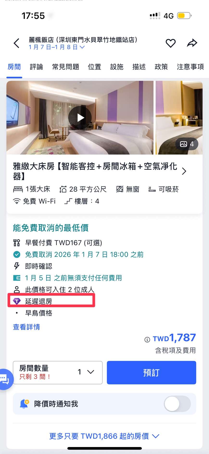 🚩提醒:遇到飯店房況緊張時,飯店可能拒絕延遲退房、提早入住、升等房型等權益,入住時記得再次確認!