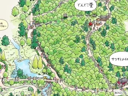 小月和梅的家,在《龍貓》中,小月和小梅搬進了一棟日式西洋風格的房子。如果你在廚房、浴室、茶室、日式房間、西式房間等地方就能聽到小月和梅的笑聲和可愛的煙灰聲。而在橡子標出的山路盡頭,有一個高約5米的木製遊樂設施“Dondokodo”,小學以下的兒童可以進入裡面玩耍喔!而Dondokodo是動畫中龍貓祈求種子發芽時所跳的舞蹈名稱!是不是很可愛呢?