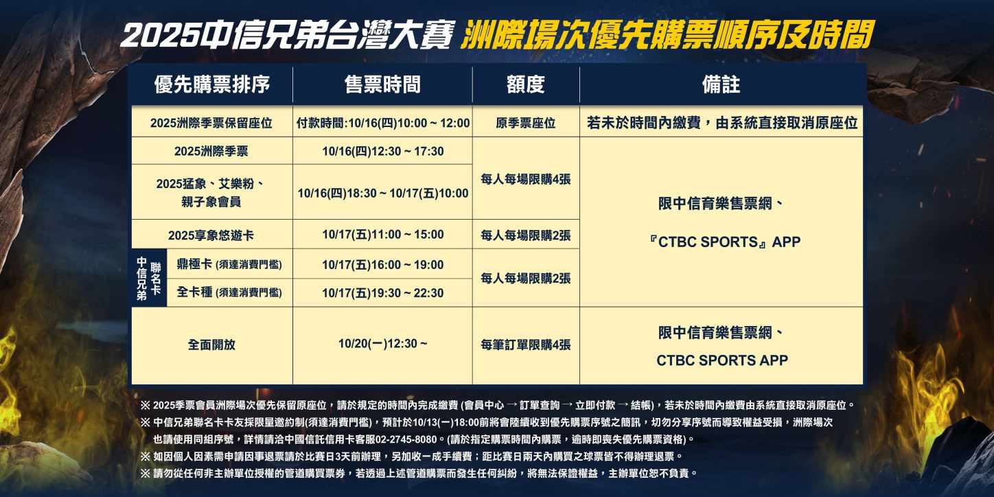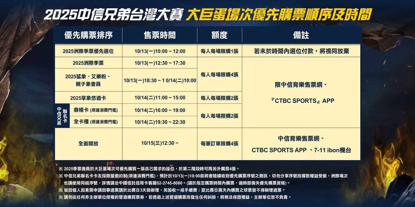 2025年,易遊網再度與中信兄弟強勢聯手,推出「中信兄弟台灣大賽 獨家尊榮VIP席套票」,將於10月14日中午12點準時開賣!套票涵蓋10月18日與10月19日兩場在台北大巨蛋舉行的台灣大賽賽事,每場限量僅452席,席位珍稀、錯過不再。