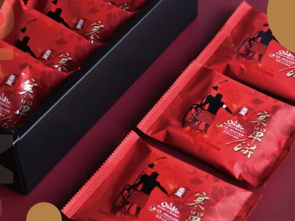 寒單餅名稱取自於東寒單寒單爺習俗,外觀類似太陽餅,裡頭使用綠豆沙加上小米麻糬,吃起來綿密有層次,因為寒單爺神有招財納福保平安之義,喜氣的外盒非常適合送禮,配上寒單爺的祝福,也有期許收禮的的朋友們都能順順利利之意。