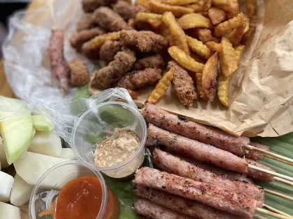 這家 Nem chua nướng cô Phượng số 10 Ấu Triệu ,旁邊就是河內大教堂了,小巷子裡面蹲坐著好多人都是在烤肉,聞起來很香,其實就是越南有名的烤豬肉香腸!不僅有細的粗的還有很多選擇~