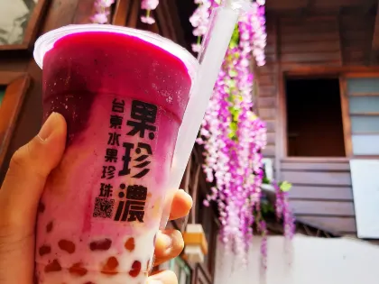 隱身在紫藤花下的「果珍濃」源自於種植火龍果的小農,店內只販售一種飲料 - 水果珍奶,夢幻漸層的飲品是由「火龍果+木虌果+初鹿鮮奶+水果珍珠」組成,皆選用台灣在地水果,現點現打完全不加水,堅持百分之百的天然飲料,在炎熱的夏天來上一杯頗為消暑!
