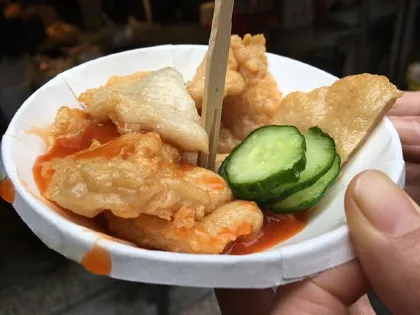 說到已開超過一甲子的基隆美食,一定要提到王記天婦羅,菜單只有炸天婦羅一個品項,每天的炸魚漿都是當天現做,新鮮又美味。片狀的天婦羅放進吱吱作響的油鍋中現炸,配上小黃瓜和醬汁,清爽可口,是來基隆廟口必吃美食。