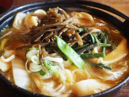 餺飥(ほうとう)是甲州的特色鄉土料理,如果來第一次來河口湖,建議可以試試看!餺飥是用味增湯底、麵粉至的麵條還有許多當地蔬菜燉煮而成的料理,其中的麵條很特別,有點像是寬扁版的烏龍麵。小作在山梨縣有幾家分店,這家分店靠近河口湖車站,不過如果自駕會更方便。