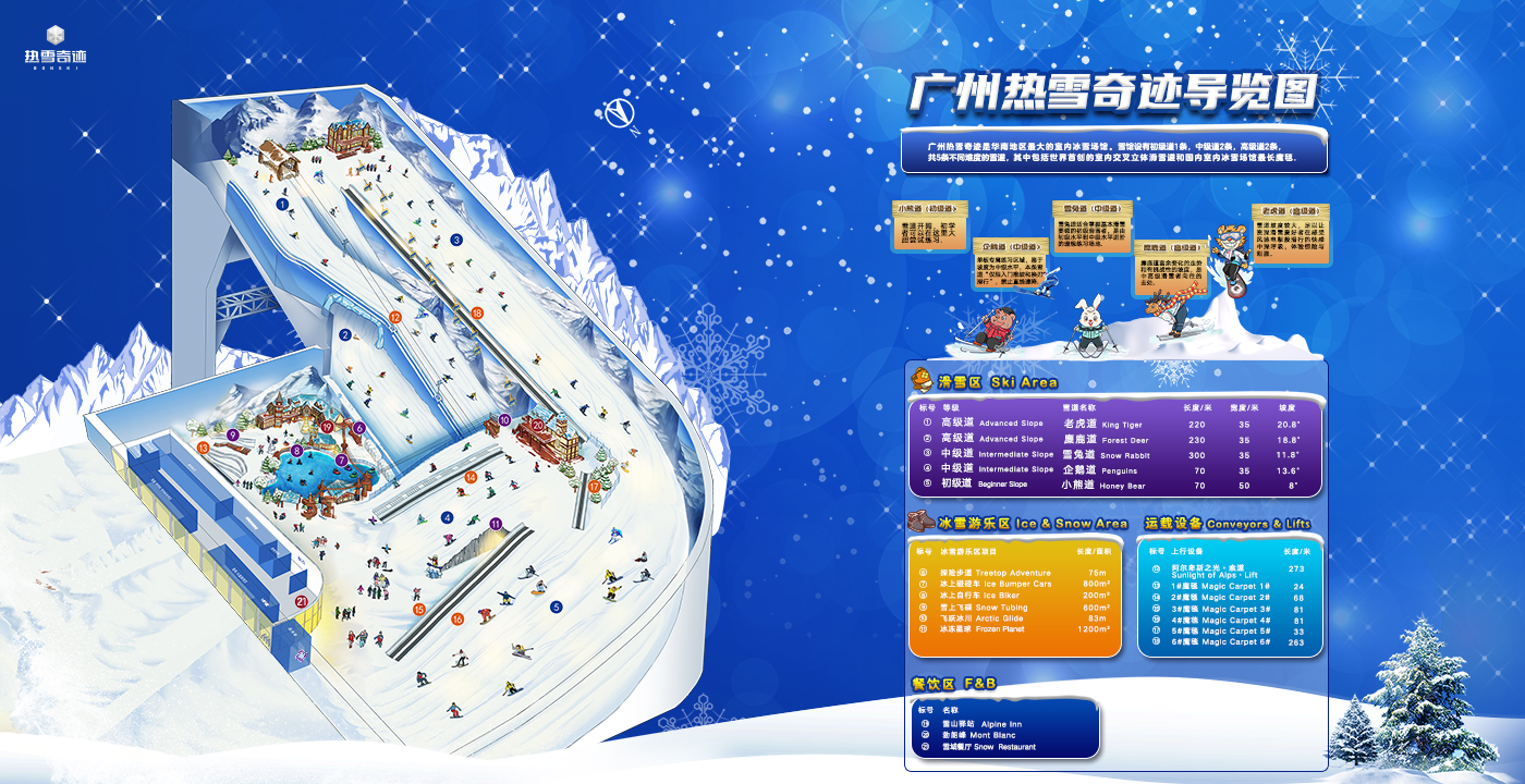 廣州熱雪奇蹟園區內有滑雪區、冰雪遊樂區和餐飲區,詳細的園區配置可參考下方導覽圖。