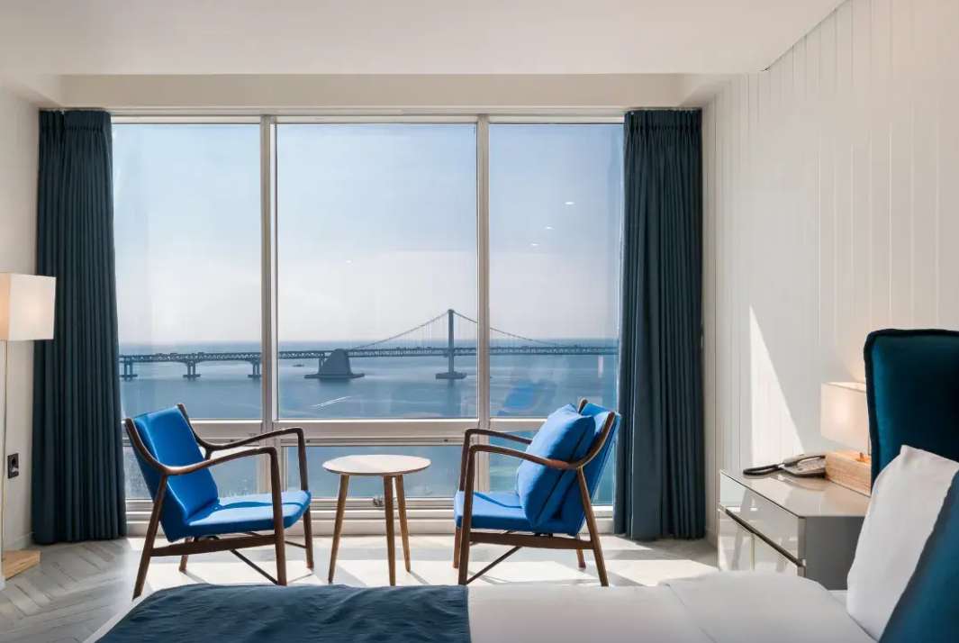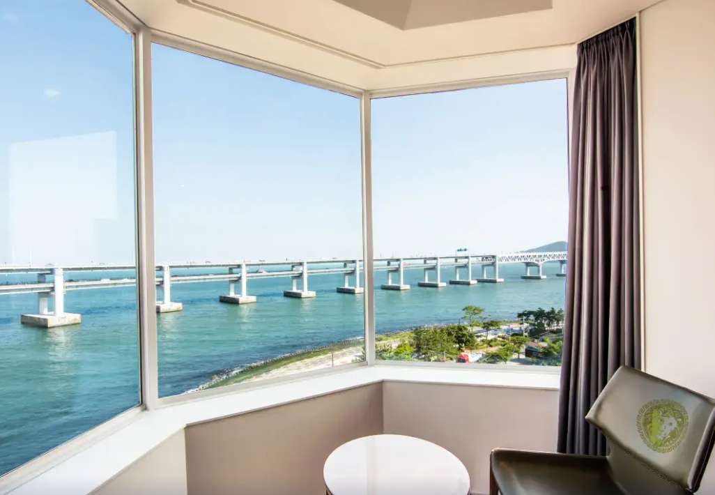酒店正對著大海。雖然能隱約看到廣安大橋,但飯店的服務、地點、停車、清潔度、內部裝潢和床品都無可挑剔。