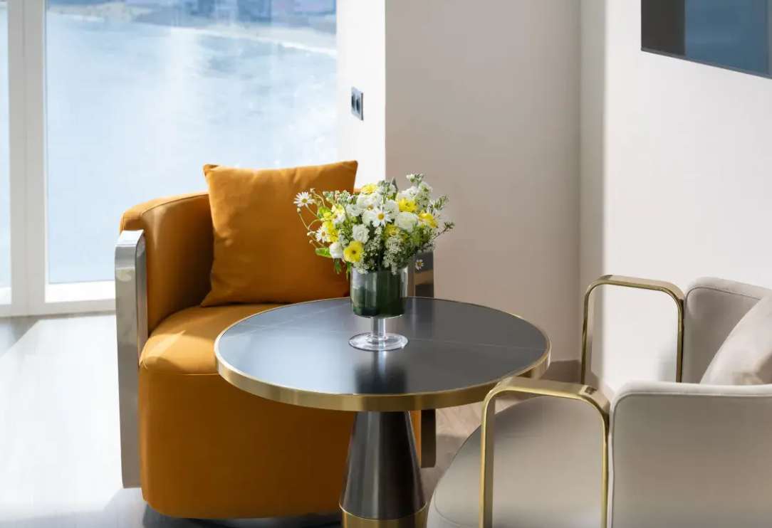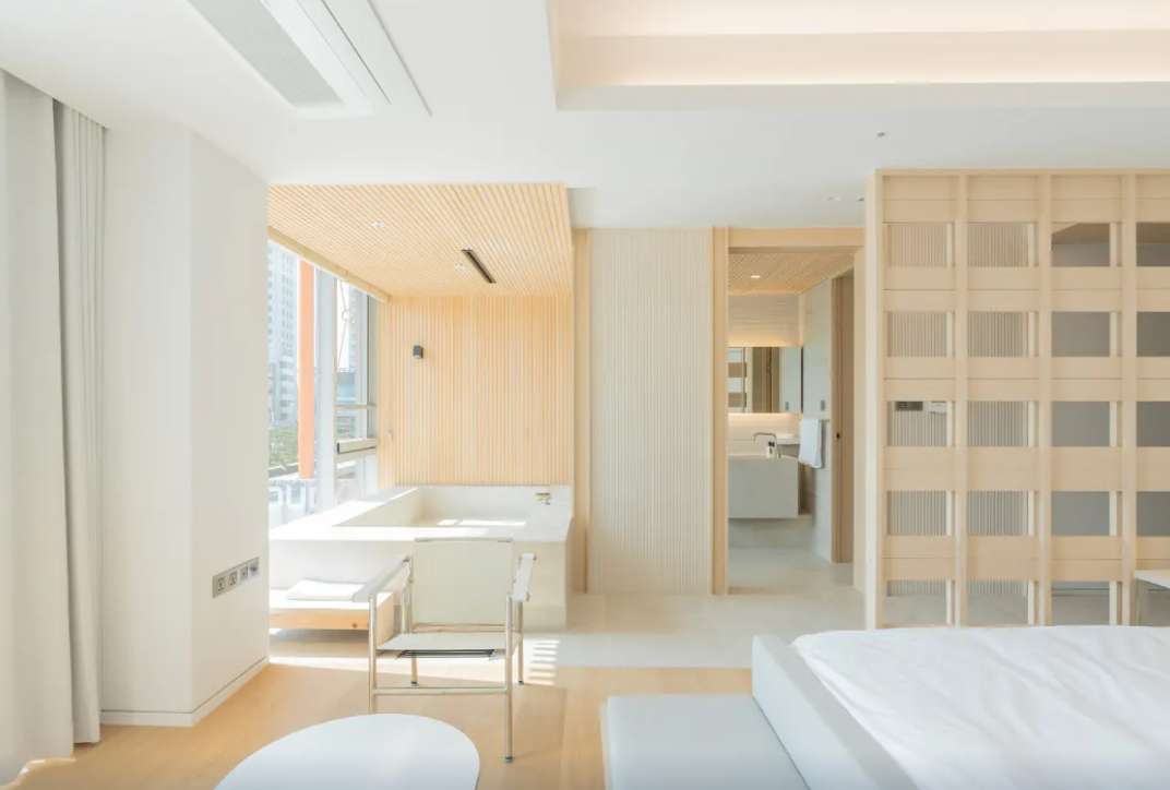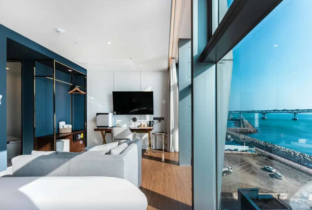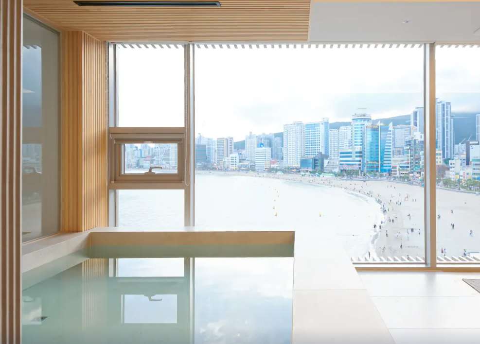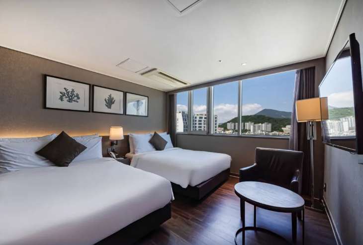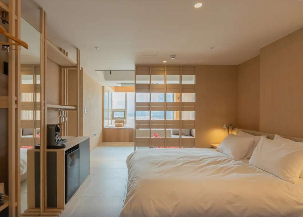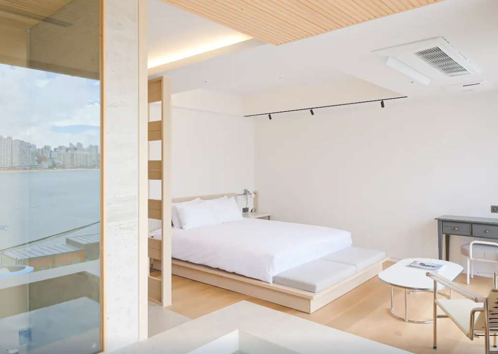 - 飯店呈現韓式簡約美學,大量木頭設計打造暖色溫馨氛圍,落地窗引進自然光線,一眼望去就是療癒的大海。