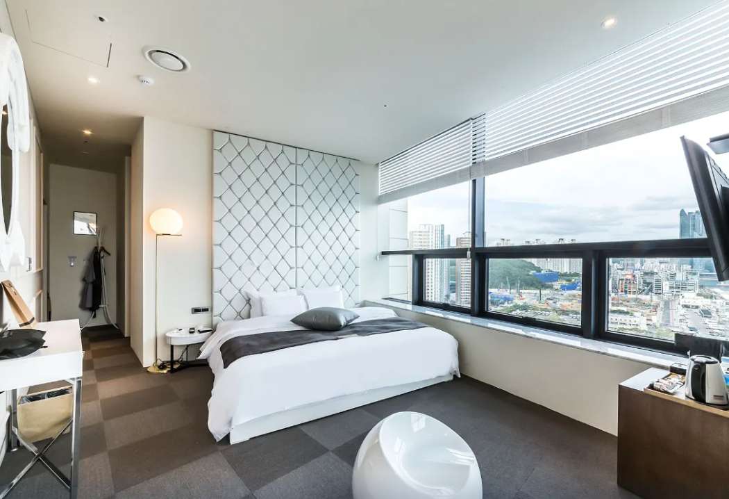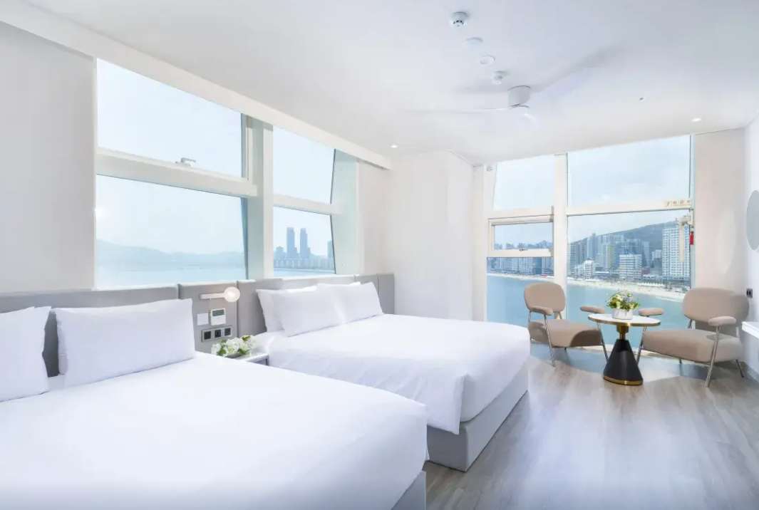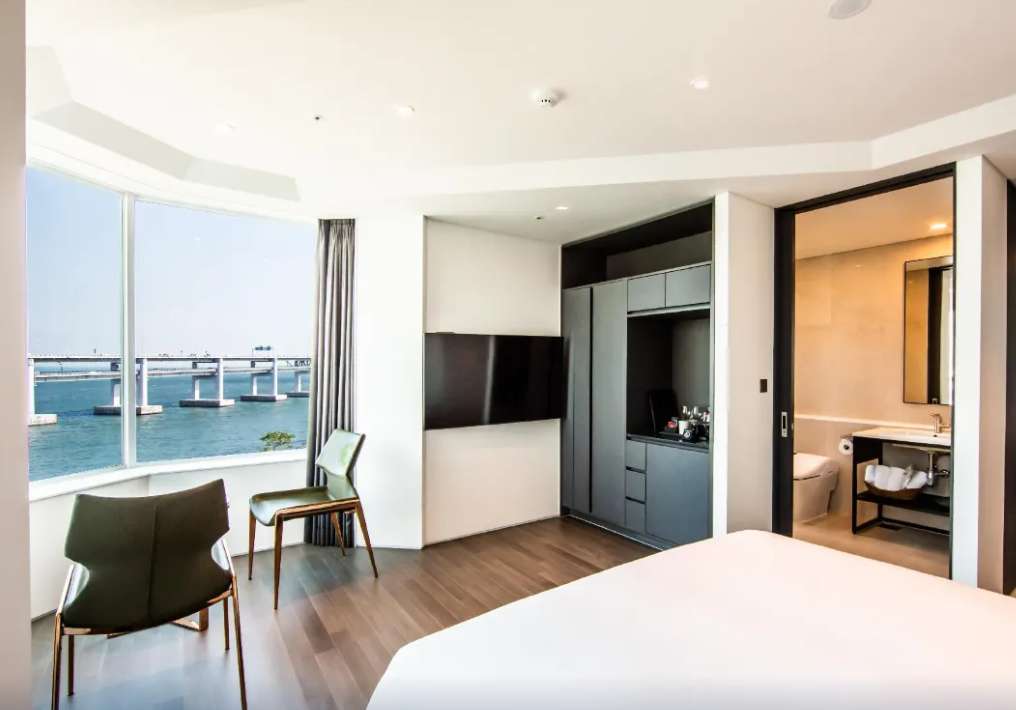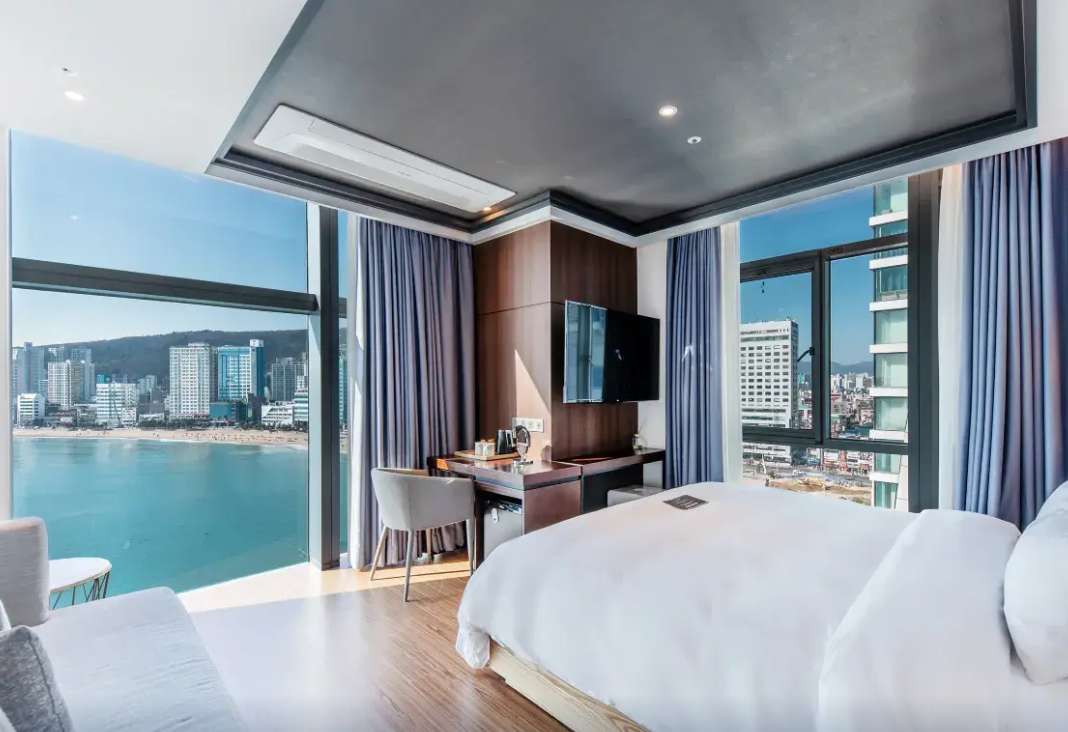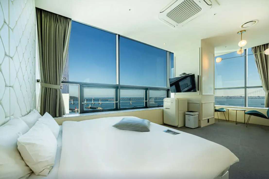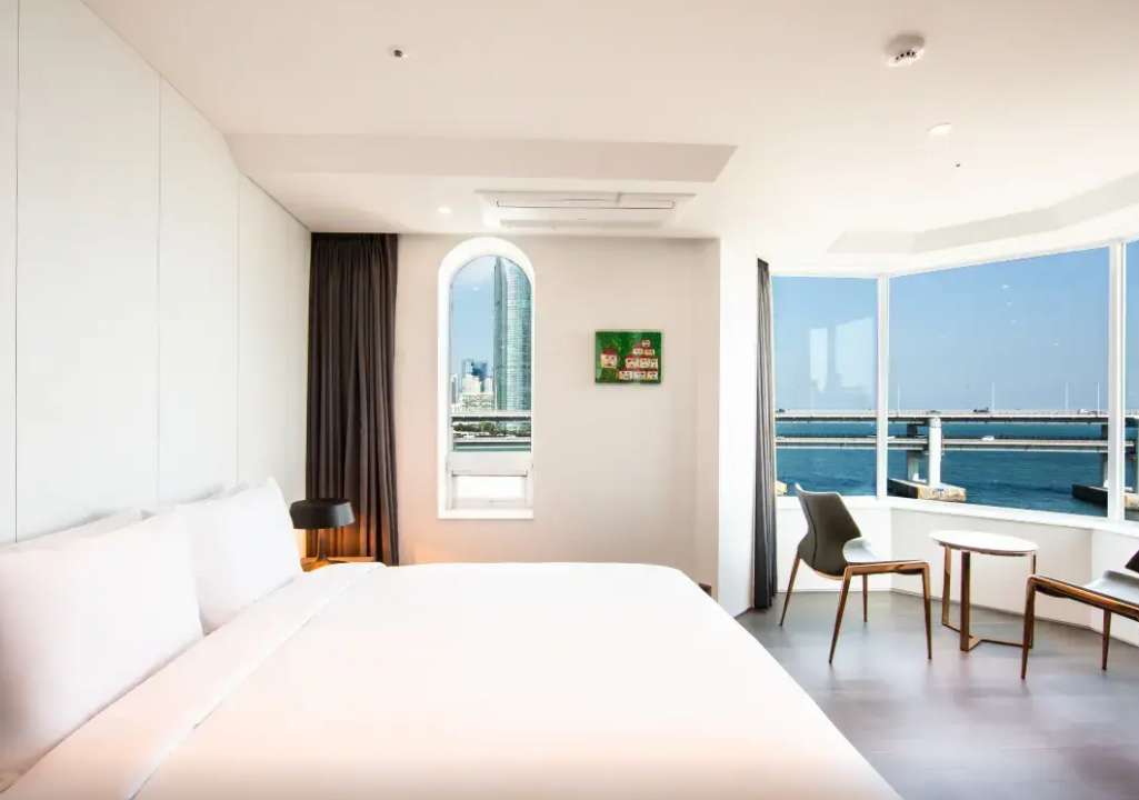 - B'AMU 飯店面對大海,從房間看出去就能看到絕美景緻,距離廣安里海水浴場也是 3 分鐘可達,能盡情享受海邊風光。