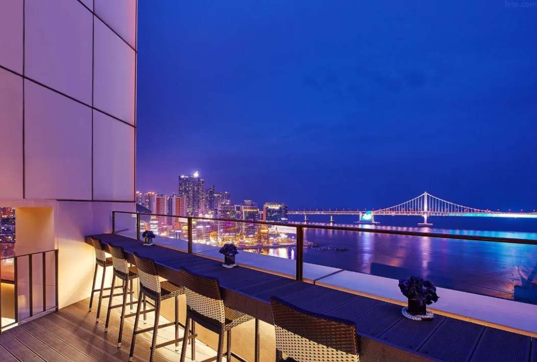 地理位置優越,前往釜山非常方便,靠近餐廳,週六晚上的無人機表演景色非常好,優質調酒師非常友善,可獲得 1000 顆星!