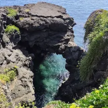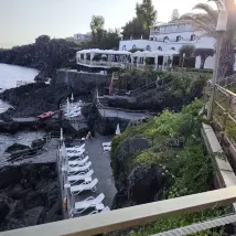 Hotel sul mare. Sala colazione all’aperto tipo gazebo con vista spettacolare su scogli e mare. Colazione buonissima. Giardino interno che porta agli scogli cui si accede dalle camere al piano 1.