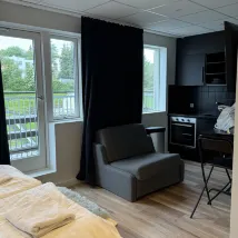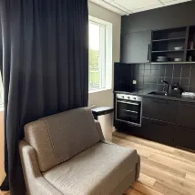 這是在阿克雷裏市區的一家酒店,樓下就是酒吧,營業到很晚,我們很晚才入住,房間特別大,還有獨立廚房和衞生間,而且還有一個大的陽台,可以看到市中心的街道,沒有前台,衹有酒吧服務員,我們到的晚,連不上Wi-Fi,第二天早晨才連上,廚房廚具沒有刀,其他都有