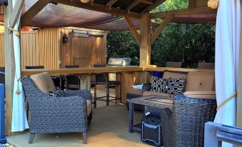 A "Jimmy Buffet Key West" 20 x 40 heated salt water pool complex with a PRIVATE HIIGH END JACUZZI FOR EACH COTTAGE a large grill with side burner, two large bars, pavilion, indoor/outdoor showers, bathroom/changing room, multiple outdoor games, two fire pit, two double hammocks and mountain/pasture views with complete privacy to enjoy the area. Most times it will be only you at the pool area. It is a working farm so there will be help around the farm to keep it well groomed for visitors.