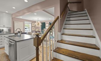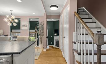 Upon entering the home, you'll step into the kitchen area, with the peaceful and cozy living room space in the backdrop. It features a smart TV to stream your favorite movies and shows on Netflix, Hulu, Disney+, etc. The living room, kitchen and dining area are all on the main floor. The beautiful dining area is perfectly situated between the kitchen and living room area, an inviting space for your entire group to engage in intriguing conversations, gather, dine-in and wine-down. The dining room features a glass table with seating for six.