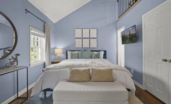 The home features hardwood floors throughout with stairs leading you to the 2nd level of the home where you will find the three bedrooms, and two full-size bathrooms. The main bedroom is plush and with it's room darkening curtains, sleeps two very comfortably in a King-size bed. It has a loft area with space for relaxing and a dedicated workspace with a desk and chair; excellent for Zoom calls or simply a quiet space to get work done. The second bedroom features a Queen bed and the third bedroom has two Twin beds.