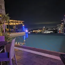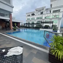 乾淨又安全,飯店頂樓有泳池,禮拜五、六、日都有現場演唱,東西也不錯吃,價格可接受,點瓶飲料可以聊天看夜景,個人覺得很棒