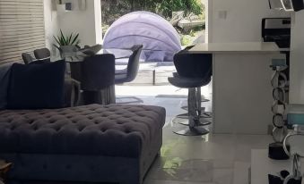 Hervana's Casa Blanca is immaculately white, from floor to ceiling, and the basic color is white. Accented by basic grays, sea-green, and aqua, this elegantly designed and decorated dwelling houses seven to nine guests, considering little children. Furnished with many modern conveniences and positioned on a tropical hillside, the panoramic view and tropical breezes make the stay more appreciable. Even the checkerboard style 24-inch floor tiles of matte and porcelain screams elegance as well as the stone white countertops with gray veins. Available transportation to and from the airport and during the stay compliment the level of the experience at Hervana's Casa Blanca.
