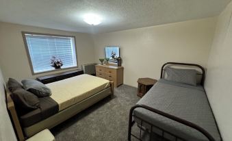 The kitchen is fully equipped with a full-size refrigerator, stove, microwave, coffee pot, dishes, pots, pans, utensils, and more, making meal preparation a breeze. A washer and dryer, along with a cleaning closet stocked with supplies, add to the home’s convenience. The first bedroom includes a full-size bed, dresser, and ample storage, while the second bedroom offers both a full-size and twin bed, along with additional storage space.
