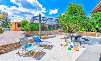 → Screened lanai with ample seating, outdoor TV, and a projector for nighttime entertainment.