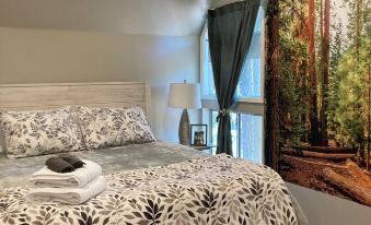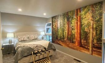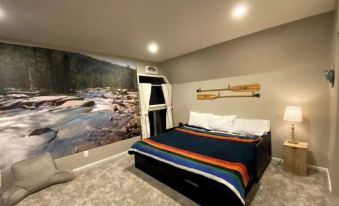 Upstairs: Full bathroom (with bathtub). The "Forest Room" offers plush memory foam queen bed. The "River Room" offers a king bed and a bunk bed, all with memory foam mattresses. This room is perfect for the kids' hangout.