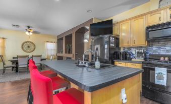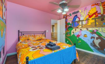 Step into a world of fun and adventure at our family-friendly home located on the 10th tee of a scenic golf course. Enjoy stunning mountain views from the covered deck with a complete outdoor kitchen, a cozy flagstone patio with a firepit, and custom murals throughout the home that transport you to another time. With themed rooms, fun games for the family, and spacious accommodations, this is the perfect getaway for families looking to create lasting memories