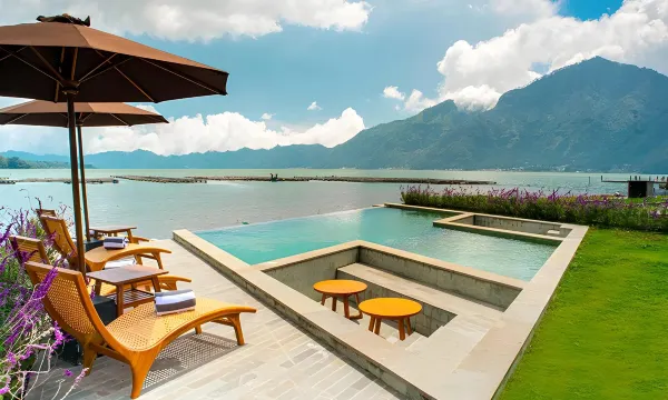 地理位置與景觀: 酒店位於巴杜爾火山與湖水附近,提供壯麗的自然景觀,尤其以無邊際泳池與房間直視湖景的設計受到好評。鄰近有便利店與餐廳(如Kopi_motor),且部分房型可欣賞火山與湖水全景,適合希望近距離感受自然風光的旅客。(根據 1 則評論)
