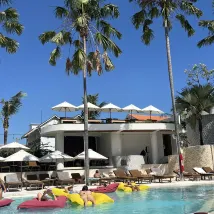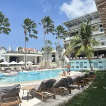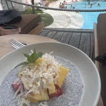 週六會有泳池派對,所以可能會比較吵,但即使你獨自一人,仍然可以在泳池邊放鬆。餐廳裡的食物種類繁多,而且比在外面咖啡館吃飯便宜。游泳池與旅館客人共用,因此其中許多是長期客人,喜歡在泳池邊放鬆。