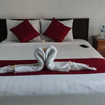 Everything is excellent. The accommodation is clean and big. The owner will serve us the local fruit and coffee or tea in the morning before we check out. They also will prepare us for the drink when we come back from the tour. The view of the accommodation is also very nice. The backside is the beach. You can cath up he sunrise early in the morning.
