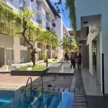 В этом отеле останавливались на 7 дней. Очень понравился обслуживающий персонал, отзывчивый и доброжелательный. Особенно хочется отметить ребят у бассейна и девушку Yona c ресепшена за помощь в наших вопросах. В отеле чисто.Порадовала ежедневная уборка номеров. Хоть сантехника уже требует замены, но всё исправно работает.В отеле два бассейна и оба хорошие,даже с игровой зоной для детей. Один из бассейнов на крыше. Номер у нас был с видом на внутренний сад отеля, сам сад аккуратный и ухоженный. Мы не особо придирчивы к питанию, потому нас устроили только завтраки, благо рядом много мест , где можно поесть. Варунг на территории отеля с очень интересной крышей, нам очень понравился. Меню хоть и не особо разнообразное, но голодными не останетесь и цены демократичные. Пляж в отеле вполне устроил, смотрите только за приливами и отливами если вам очень нужно купаться. при отливах вода критично уходит с пляжа, как и во многих местах на Бали. Пляж регулярно убирают, и он всегда чистый, но море всё равно выносит мусор. Если это водоросли , то это нормально. Но всякий пластик это конечно печально.Но это не заслуга отеля и данного места, а скорее всего человечества((((! Не понравилось близость катания скутеров и лодок рядом с пляжем, пот той причине, что сильно пахнет от этого транспорта выхлопом! Так что иногда приходилось уходить с пляжа , когда начинали массово кататься эти ребята.