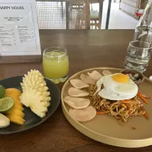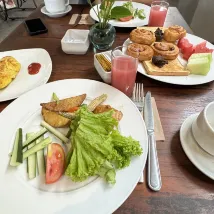 Плюсы удобное место расположение в центре города, до пляжа 20 минут пешком, есть тротуар, рядом есть кафе и рестораны, на параллельной улице все услуги на 30% дешевле. Завтра на вынос ужасный, выбрали Американский - 1 тост , жареное яйцо и три дольки арбуза ( т.е. на него не рассчитывайте) . Необходимо заменить чайник в номере ( старый, со странным запахом внутри).