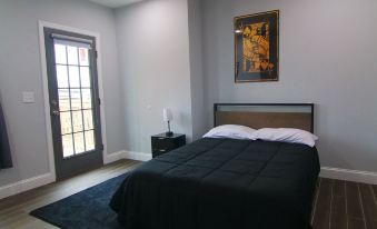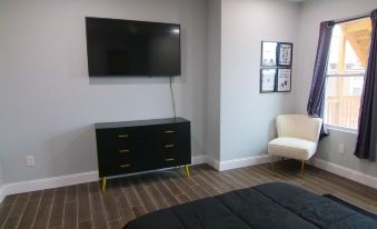 Upstairs you'll sleep comfortably in the king suite, where you can also work uninterrupted at your private standing desk space. To relax, watch your favorite movies and shows on the 65in mounted over the electric fire place. The suite also boasts a private bathroom with a double vanity, waterfall shower head, and a bluetooth speaker to sing along to your favorite tunes.