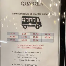 服務態度很好,地理位子離BTS有點遠,但是,飯店有接駁車。走出飯店第一個十字路口就有一間7-11,也有燒肉店,滿多吃的,方便。 地理位子算是很好,房間很乾淨,屬日式風,有客廳、廚房、(訂的房型是家庭房,2房之間有隔一道門)早餐算是簡單、樣式雖不多,可是,做的很精緻。飯店也有泳池。 CP值算很好了。 下圖是到BTS接送時間。