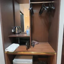 這家飯店簡直太棒了。地理位置非常便利,就在市中心。房間沒有窗戶,但感覺不到…空調運作良好,房間燈光很棒。飯店免費提供早餐,果醬吐司、咖啡和茶都很棒。我住了兩天,但每天清潔和更換床單。前台人員非常友好,總是樂於助人。飯店內部全是木質裝飾,非常漂亮,入口處有桌子可以坐。而且,以市中心的價格來說,價格非常合理,我一定會再來的。