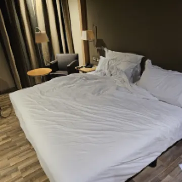 位置很好,但房間雖然乾淨,但有點過時。陽台門的橡膠密封膠脫落,我們可以聽到房間裡的風聲。自從我們在 2023 年 12 月入住以來,房間相當冷,幸好有暖氣。如果有房間拖鞋就更好了,房間和浴室的地磚很冷。