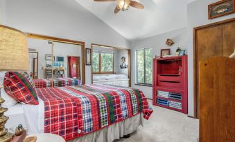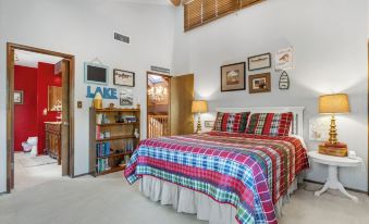In addition to its convenient location near Bass Lake, the cabin also features five cozy bedrooms with fresh bedding and comfy mattresses, making it easy to drift off and get a great night’s sleep. On the top floor you will find three bedrooms. The first bedroom includes a queen size bed and does have direct access to the guest bath, which may also be accessed from the hallway. The two remaining bedrooms on the top floor are furnished with two twin beds each, perfect for the kids! There is also a queen bedroom on the main floor. On the lower level you will find the final queen size bedroom.