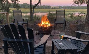 The open layout combines the living area with a Smart TV and a Chef's kitchen complete with all equipment and spices with a breakfast bar (seating for 3). Enjoy your morning coffee sitting in the backyard area under the Spanish moss canopy of Southern live oaks and pines or roasting marshmallows at night at the outdoor fire pit. Our cozy Cottage offers our guests their own piece of paradise here in the Lowcountry.