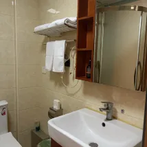 由於孩子困了,就在附近搜到了這家賓館,到店後給升級成了高級大床房(榻榻米),但進入房間後發現真心一般,房內喝水杯子沒有,刷牙杯子的也沒有,客人用不用但你得給準備上吧,屋子裡有些涼開會兒空調吧,空調是一會兒有風一會停了(還不制熱),那就是加一個被子吧,就去前台問了問,態度立馬變了,説空調好好的肯定沒壞,加被子沒有,我説那就再給個被罩,就開始挑毛病呀説大床房怎麼能住三個人呢,我説辦理入住時候就説了帶孩子一起入住的,最後還是很不情願的給拿了個被罩!