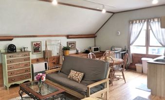 Sunny, warm studio apartment near downtown. This second-floor space has an open layout with kitchenette, bathroom, dining table, queen-size bed and lounging area. A full-size futon couch accommodates extra friends or kids. Plenty of appliances for cooking. Movies, books and streaming TV services for rainy days or evenings in. Our homey, comfortable apartment overlooks a lush perennial garden in a quiet residential neighborhood. Walk to Main Street or the waterfront in less than 10 minutes.