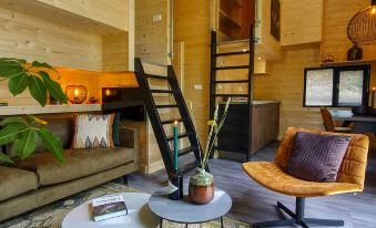 Child friendly resort "EuroParcs Maasduinen", surrounded by trees. Outside the resort, 3 km from the centre of Belfeld, on the lake, in the countryside. For shared use: indoor pool (seasonal availability: 01.Apr. - 31.Oct.). Children's playground. In the complex: reception, restaurant, bar, WiFi, fitness room, table tennis, laundry, bicycle rental. Public parking. Shop 2.7 km, supermarket 2.7 km, railway station "Venlo" 10 km. Nearby attractions: Fun Forest 4 km, Attractiepark Toverland 15 km, Outlet shopping Roermond 17 km, Kasteeltuinen Arcen 18 km, Hertog Jan Brouwerij 20 km, Nationaal Park De Maasduinen 32 km. Well-known lakes can easily be reached: De Maasplassen 30 km. Please note: car recommended. Entertainment in the season. The owner does not accept any youth groups. The photograph shows a typical example. Additional accommodations can be booked. All houses/apartments are individually designed/furnished. The holiday properties may differ in living space, floorplan, equipment and furnishing. "Tiny House 4", 3-room mobile home 35 m2. Beautiful and wooden furniture furnishings: living/dining room with Scandinavian wood stove, dining table and TV. Exit to the terrace. Small gallery with 1 double bed. Small gallery with 2 beds. Kitchenette (kettle, combination microwave). Shower/WC. Electric heating. Terrace. Terrace furniture. Facilities: children's high chair, baby cot (extra). Internet (WiFi, free). Parking at the house. Please note: non-smoking house. Bookings accepted for holiday purposes only. A deposit of 100 EUR per person can be charged on site. Instead of an enclosed bedroom, some sleeping areas are located in an open-plan area (gallery, alcove, etc.).
