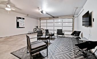 Indoor bike storage and tools provided in the garage update that doubles as another hang out area with games, seating, and a TV.