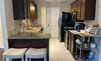 * Full kitchen with fridge, microwave, oven, & equipped with pots, pans, silverware, plates, cups