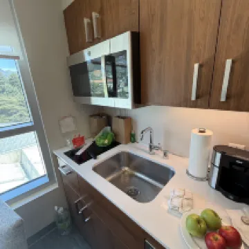 酒店是套房,距離伯克利步行5分鐘。有冰箱微波爐洗碗機刀叉餐盤,我們正好從cosco買的烤雞藍莓簡餐等,一加熱非常舒服,還有電陶爐,煮了酸辣粉