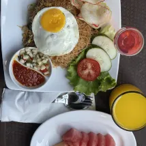 我是獨自出遊。1 來回碼頭交通:該酒店距離渡輪碼頭1.8km。從渡輪下來的時候沒打車,帶着行李走了一會,中途遇到一個度假村管理人員開着很小的車順路帶了我一程送到酒店門口了;離開的時候,酒店安排了一個出租,費用8萬盧比摺合人民幣37元,其實開車就2分鐘路程,這個費用其實有點小貴,而且費用是給到酒店方面不是直接給到司機的,估計酒店拿了提成的。1 我預訂的單人間有的有窗(也不能打開),有的沒窗,但是網站上的照片看起來是有窗的,入住後前台給我安排了一個沒窗的,於是我向攜程投訴,攜程讓我拍房間照片,上傳客服系統,攜程認為我的主張有理,協調後,客服給我換到了一個有窗的邊角的單人間,我覺得還可以接受。2 房間的確較小,28寸大箱子打開後,過道就堵塞了,這個也符合預期,畢竟是經濟酒店的單人間嘛。房間也是沒有冰箱的。 3 早餐,客人少的時候,要預約時間(地方時間最早8點開始早餐,而其實在新加坡這時已經9點了,天早就亮了)和選擇類型,人多的時候,是自助早餐,兩種情況我都遇到了 4 該酒店沒有自行車提供給客人使用,所以外出很不方便,客服給我租賃了加汽油的摩託車(估計是當地人有空暫時不用的),每天30萬盧比(摺合人民幣140元每天),我覺得這個價格是峇裏島兩倍了。但是客服説在民丹島差不多就是這個價。也許峇裏島人口稠密,遊客很多,所以有不少摩託車租賃店,民丹島度假區根本沒有這種專門的店,推測應該就是酒店找當地人借的摩託拿來租給客户的。我租賃了2天,每天騎行100多公里,中途體驗了在正式的加油站加油,在小賣部用簡易玻璃罐加油,購買大瓶1.5升裝汽油用漏斗加油三種形式。第一天去了南邊的藍湖沙丘、民丹山邊一個Cilff Cafe(懸崖餐廳午餐,是個制高點,可以看到民丹山景)、丹絨檳榔(在那裡找個了按摩,90分鐘25萬盧比摺合人民幣120元,比較便宜,不過沒有單獨房間,都是拉着簾子隔開、鋪在地上的墊子,印尼大媽按摩),第二天去了東邊的Trikora海灘看了許多沙灘上的水上人家,還去了東北角紅樹林邊上的PANLONG漁村(海上吉普賽人),然後去了北邊度假區的Lagoi湖、水庫、Lagoi沙灘,這裏都是開放的,晚上去了娜灣花園那邊,可惜KELONG海鮮餐廳週一關門我不知道,沒吃上海鮮。衹要説進去吃飯,度假村門口的保安就會放行,所以沙灘你也可以去的! 5 路上遇到有一些人是租賃了山地自行車騎行之旅,會有服務車輛跟着騎行者,但這速度比我的摩託慢多了,實際上不適合遊覽景點,而且在民丹島很曬的喔!防曬霜猛擦也防不住曬黑啊!還是別騎行了! 5 酒店所在是一個小聚落,有當地人吃飯的食閣food court,小超市,還有2家按摩店,不過按摩價格都是跟度假區一樣定價的,是丹絨檳榔當地按摩店的2-3倍了。這個小聚落的南面就是紅樹林之旅(白天乘船)、螢火蟲之旅(夜間乘船),我騎摩託2天,經過了很多橋樑、河流、海灘,看了太多的紅樹林了,於是就沒去參加這個船上的紅樹林之旅了。 最後再次説一下重點的建議!如果酒店免費給客户提供自行車,那就方便了,客户可以騎着去臨近的寶藏灣和美麗的潟湖泳池(Anmon安夢度假村的配套),買票就能進去享受和游泳!客人也可以騎行到Lagoi湖、水庫和Lagoi沙灘,這裏也是開放的;客人也可以起到娜灣花園到海灘以及去Kelong餐廳吃海鮮,這樣實際上度假區的核心配套也都能享受到。民丹島度假區是印尼委託新加坡管理的,本身區域挺小,租賃摩託的話,價格顯得貴了,並不划算,而步行又顯得太大了。所以,沒有免費自行車,客人哪兒也去不了,是個重大遺憾。建議酒店方面後續考慮到。