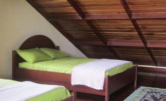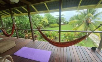 The house offers a relaxing living area with plenty of sitting room for all, as well as a large balcony with majestic ocean and island views. There is also a small balcony in the back to enjoy the alluring jungle scene. While sitting on the balconies, one can be serenaded by the ocean waves and jungle noises (birds, howler monkeys, tree frogs, etc). The balconies are perfect spots for enjoying the surrounding landscape filled with tropical foliage (plants, flowers and fruit trees) which draws a variety of tropical birds.