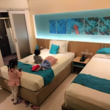 The whole place was simple, but still feels like a classy hotel somehow. The room wasn't big but spacious enough for a family. The ambiance is good, won't feel like a cheap hotel, yet the price is very affordable. The beds are relaxing. The whole place is clean especially the rooms. The location wasn't beach side but it's very near the beach and accessible to it, also to stores near by, especially the D'mall. It's easy to take a local ride because it's in the center, and front of the road.
