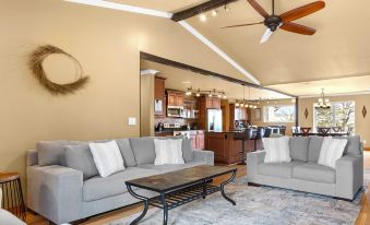 Living room has a beautiful open floor plan with open kitchen. Dining room are has two tables . Kitchen has large island with bar stool. Area is perfect for large groups to gather and hang out.