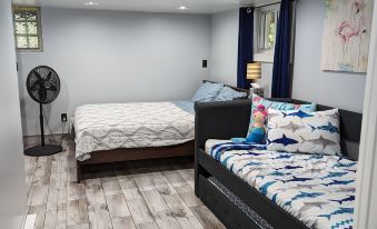 Basement bedroom with a queen bed and trundle bed that contains two smaller single beds (best for children).
