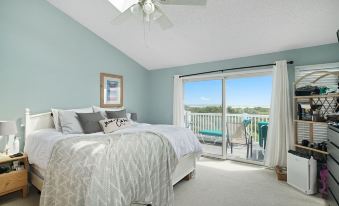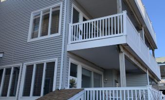 The 2nd floor oceanside bedroom is decorated in a contemporary beach style and has a queen bed. It features a private deck with two Adirondack chairs. It has it's own private bath with tub/shower combination. The 3rd bedroom faces the west toward the bay and includes 2 twin beds, and a private bath with shower/tub combination.