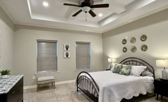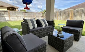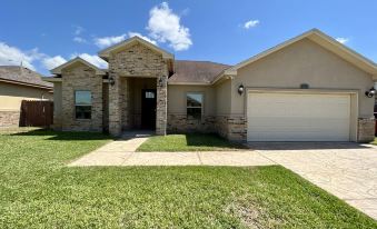 Golden sanctuary to enjoy the wonders of Brownsville, Texas. Feel at home with high ceilings and open floor plan. Spacious main layout and fully stocked entertainers kitchen allows for joyous gatherings. Laundry room with full amenities included.Comfortable stay in large bedrooms. Spa like primary bathroom with a large walk-in shower, makeup station, and two sinks. Prime location for quick access to shops and restaurants and major highways, to explore the local restaurant and bar scene or head to the beach.