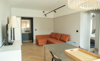 The apartment offers a cozy bedroom, a dining area, kitchenette, air conditioning, high-speed WiFi, and a smart TV.