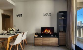 It features a spacious balcony with a city view, dining area, and a fully equipped kitchen with stove, oven, microwave, electric kettle, toaster, and refrigerator. The bedroom has a comfortable double bed, air conditioning, elegant curtains, bedside tables, and lamps. The living room includes a fold-out sofa, TV with HDMI, decorative touches, and a vibrant atmosphere. For your comfort, there is also a hairdryer, iron, towels, and bed linens. A shared washing machine is available one floor above.